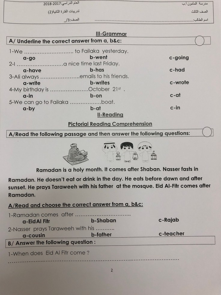 • تدريب الورقة التقويمية للصف الثالث