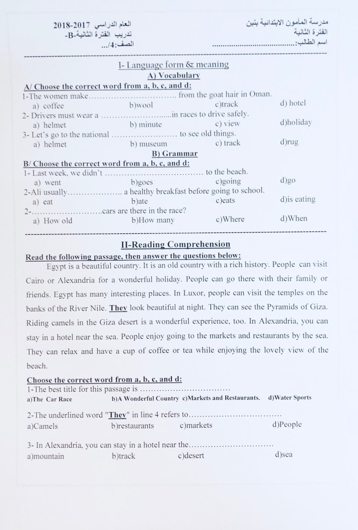 • تدريبات الورقة التقويمية للصف الرابع