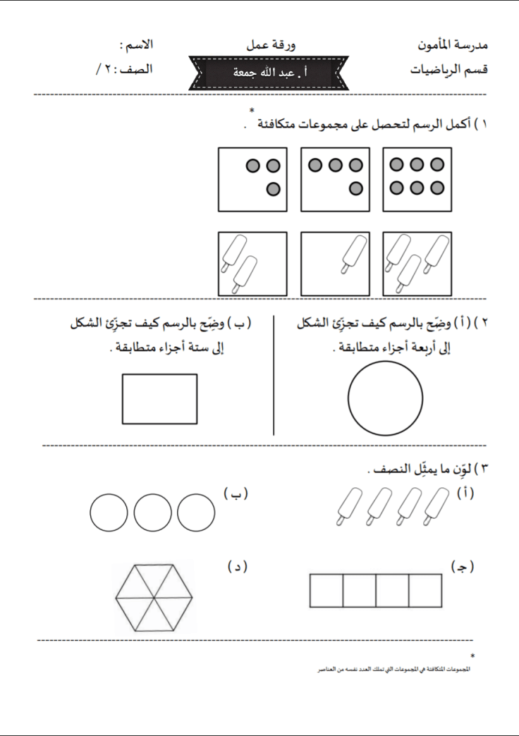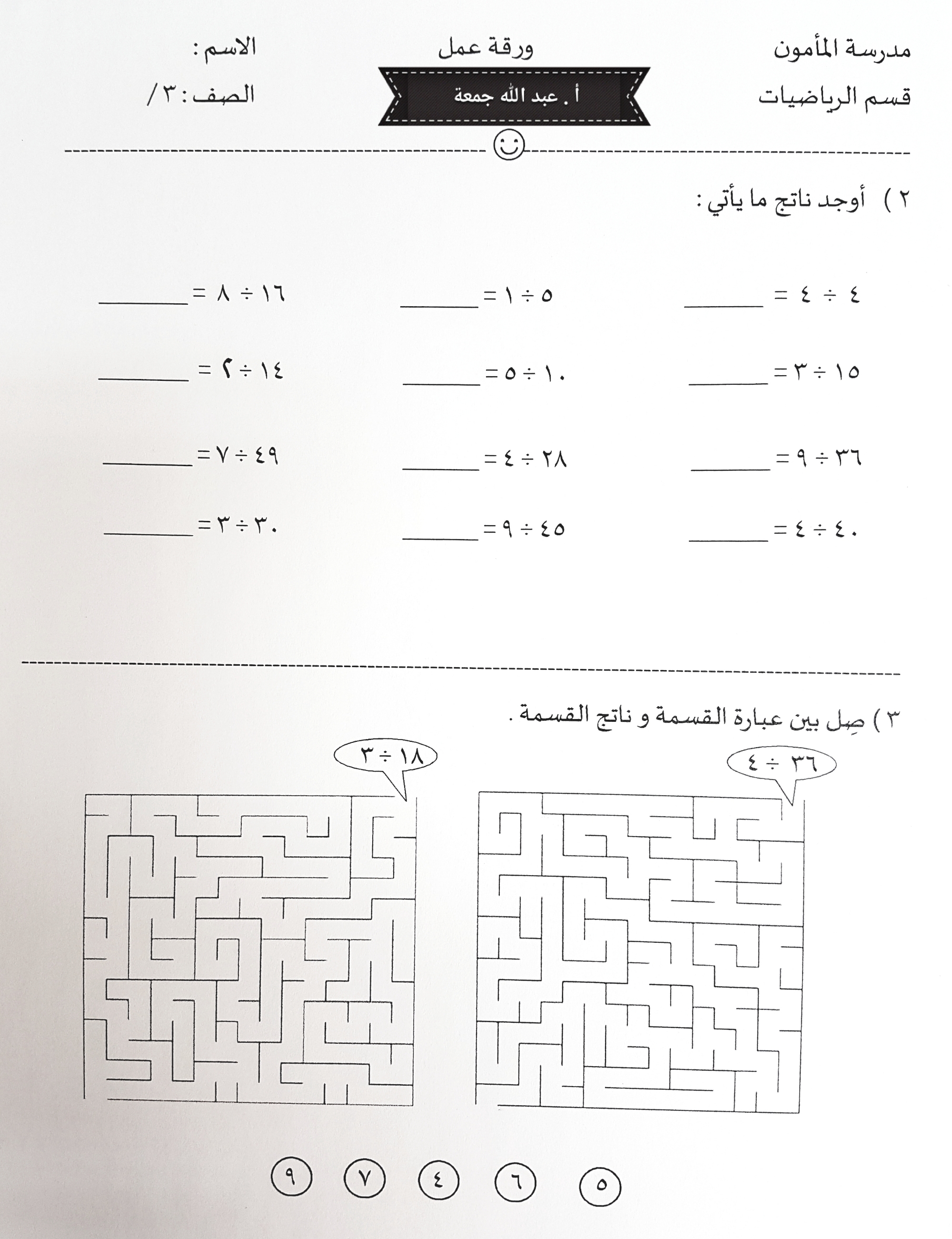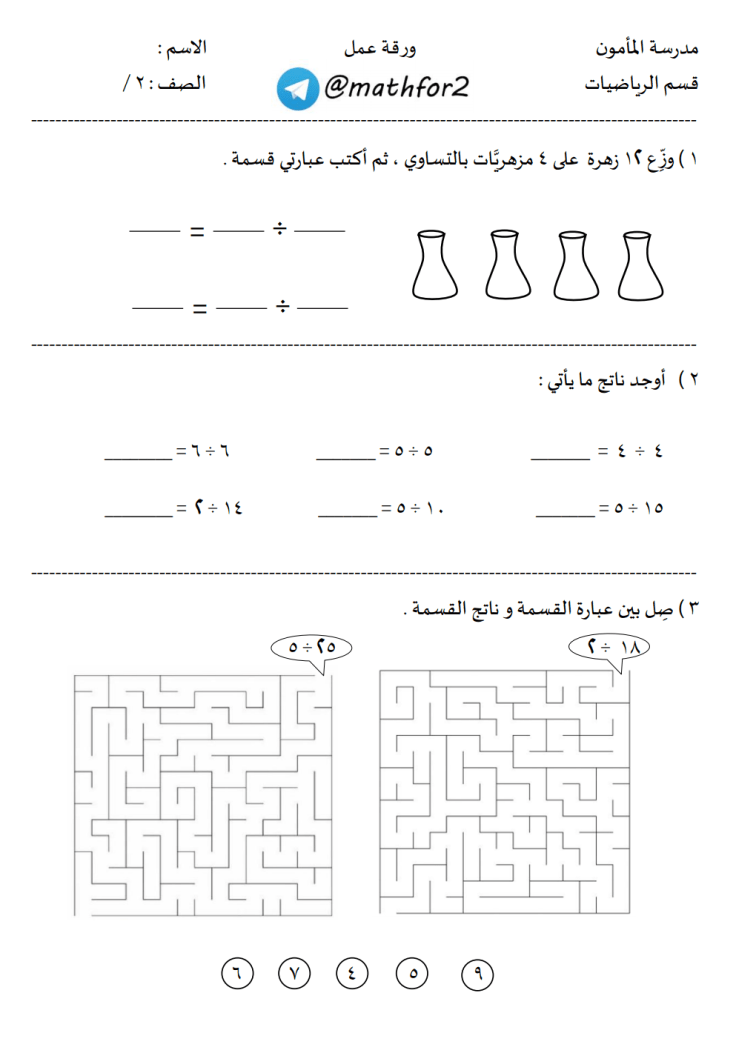 ورقة عمل للصف الثالث حول موضوع القسمة