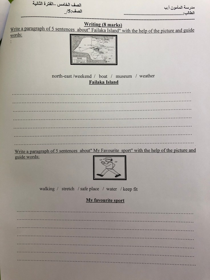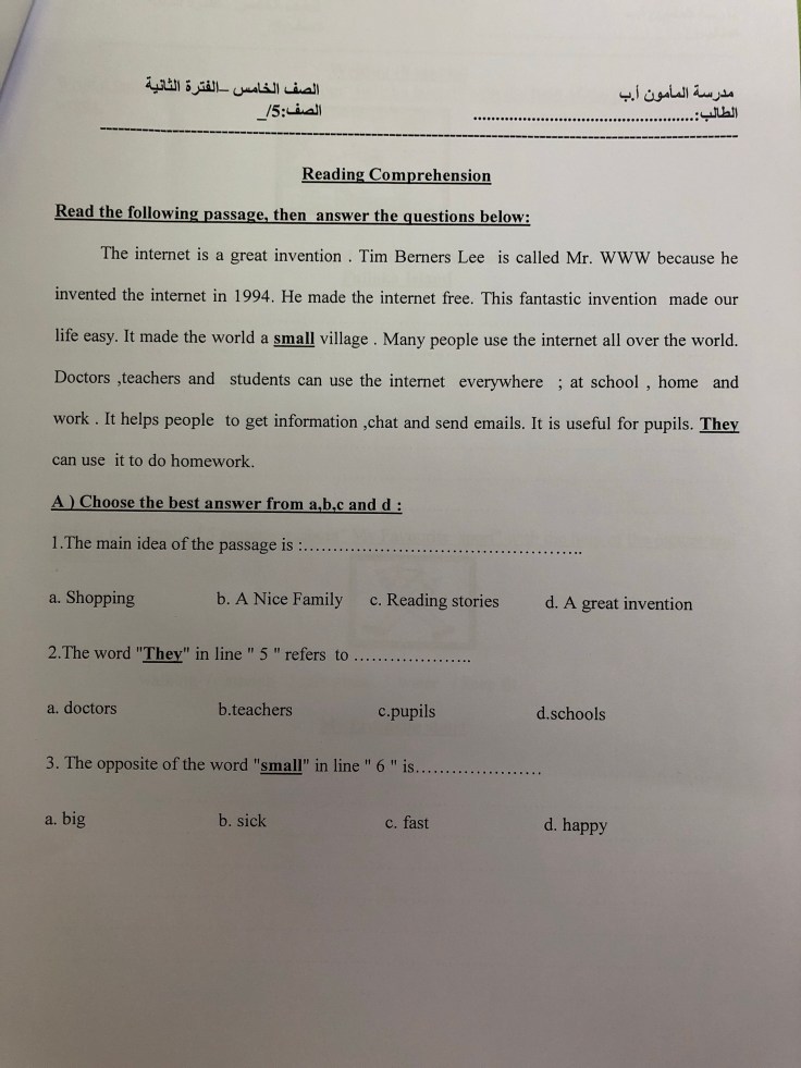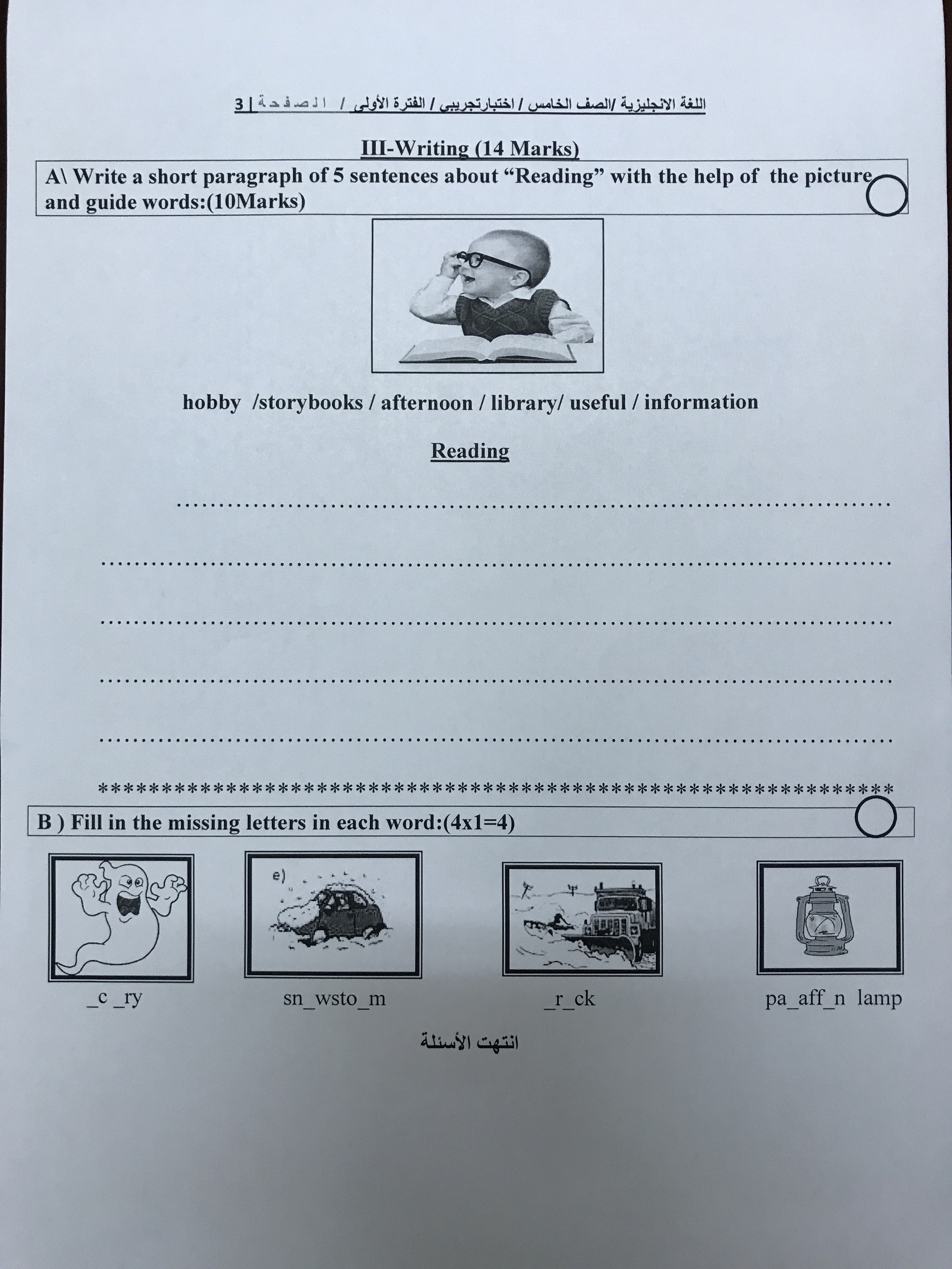 اختبار تجريبي للفترة الدراسي الاولى للصف الخامس