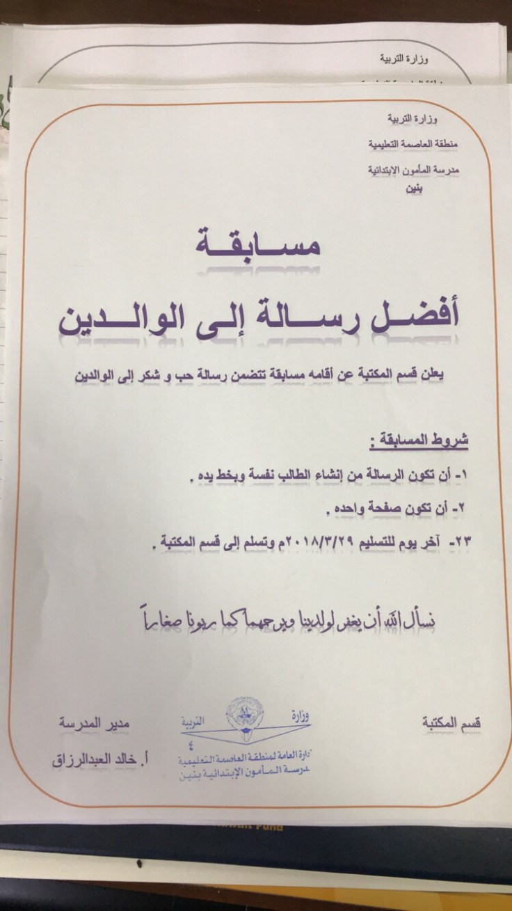 كرم مدير مدرسة المأمون ا/ خالد عبدالله النصار صباح اليوم رؤساء الأقسام العلمية بالإنابة عن أمينة المكتبة ا/ روضة اللهو لتفعيلهم دور المكتبة المدرسية خلال العام الدراسي الجاري.
