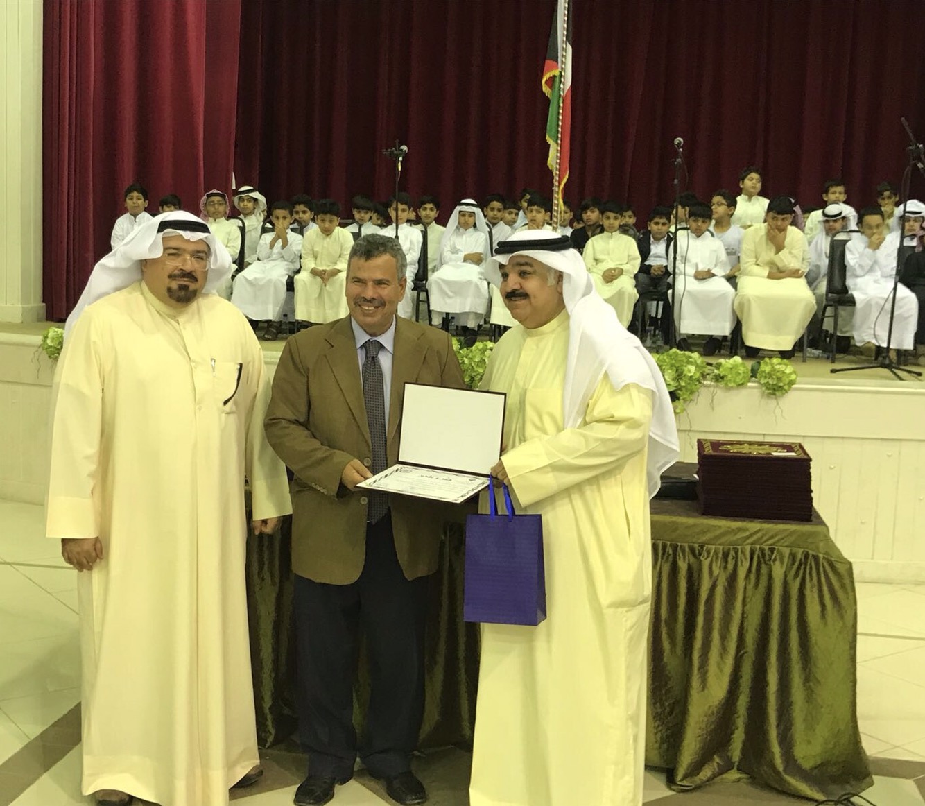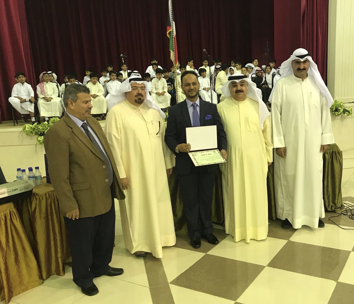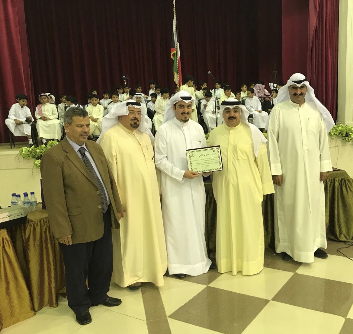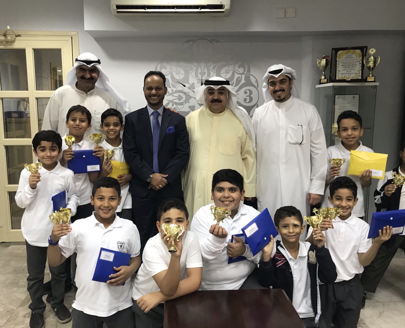 بدوره، تقدم مدير ادارة المدرسة ا. خالد النصار صباح اليوم بتقليد الميداليات الذهبية لابطال فريق المدرسة لكرة القدم بمعية اعضاء مجلس ادارة المدرسة، الى جانب تكريم مدرب الفريق معلم التربية البدنية ا. عبدالرحمن البناي على جهوده الكبيرة مع الطلبة.