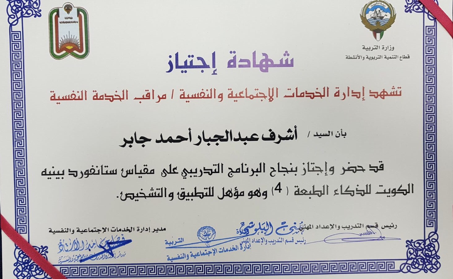كرم مجلس ادارة المدرسة الاخصائي النفسي ا/ أشرف عبدالجبار لاجتيازه بنجاح البرنامج التدريبي على مقياس ستانفورد بينيه الكويت للذكاء وهو مؤهل للتطبيق والتشخيص