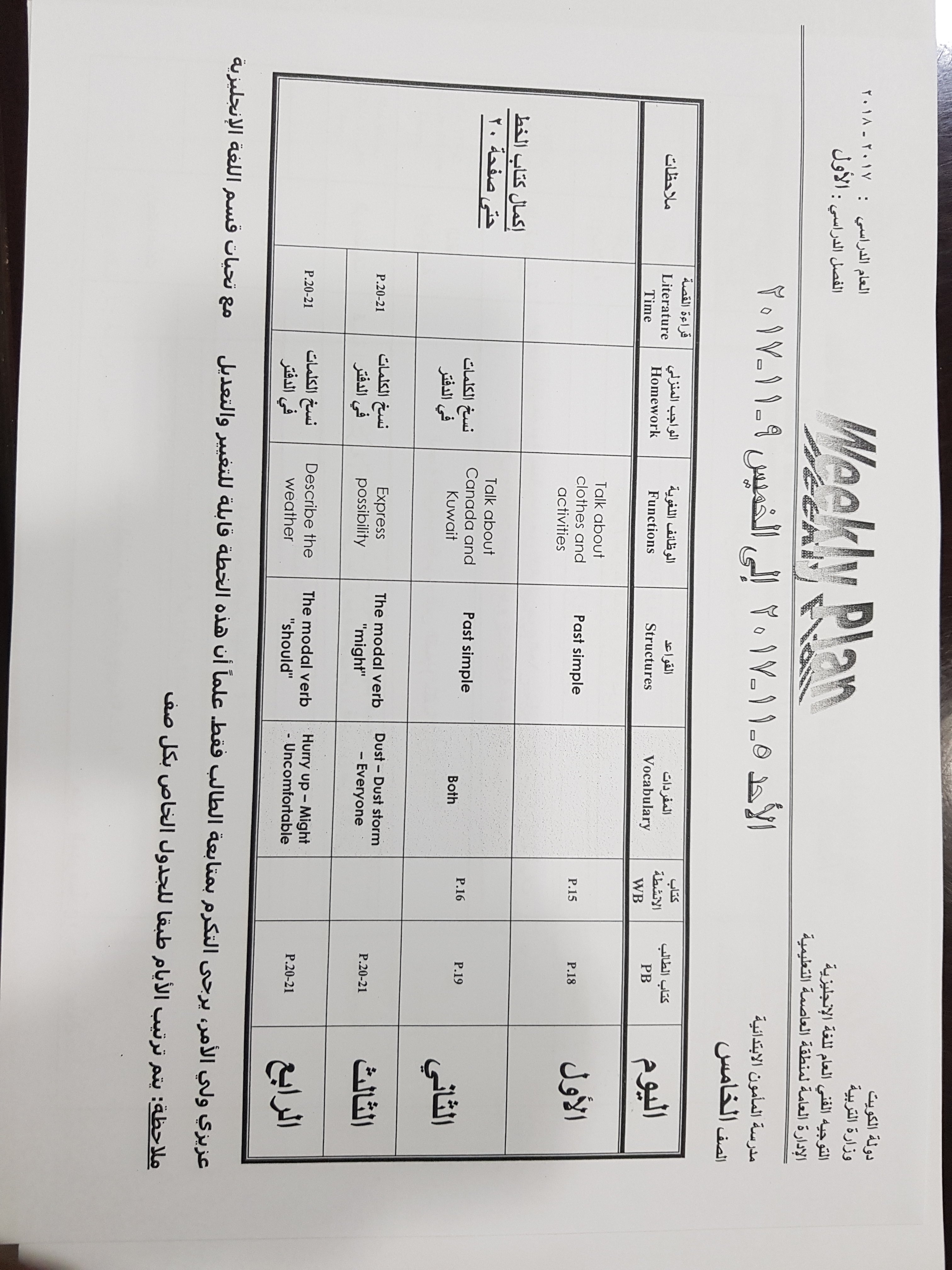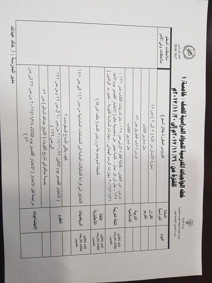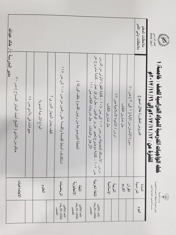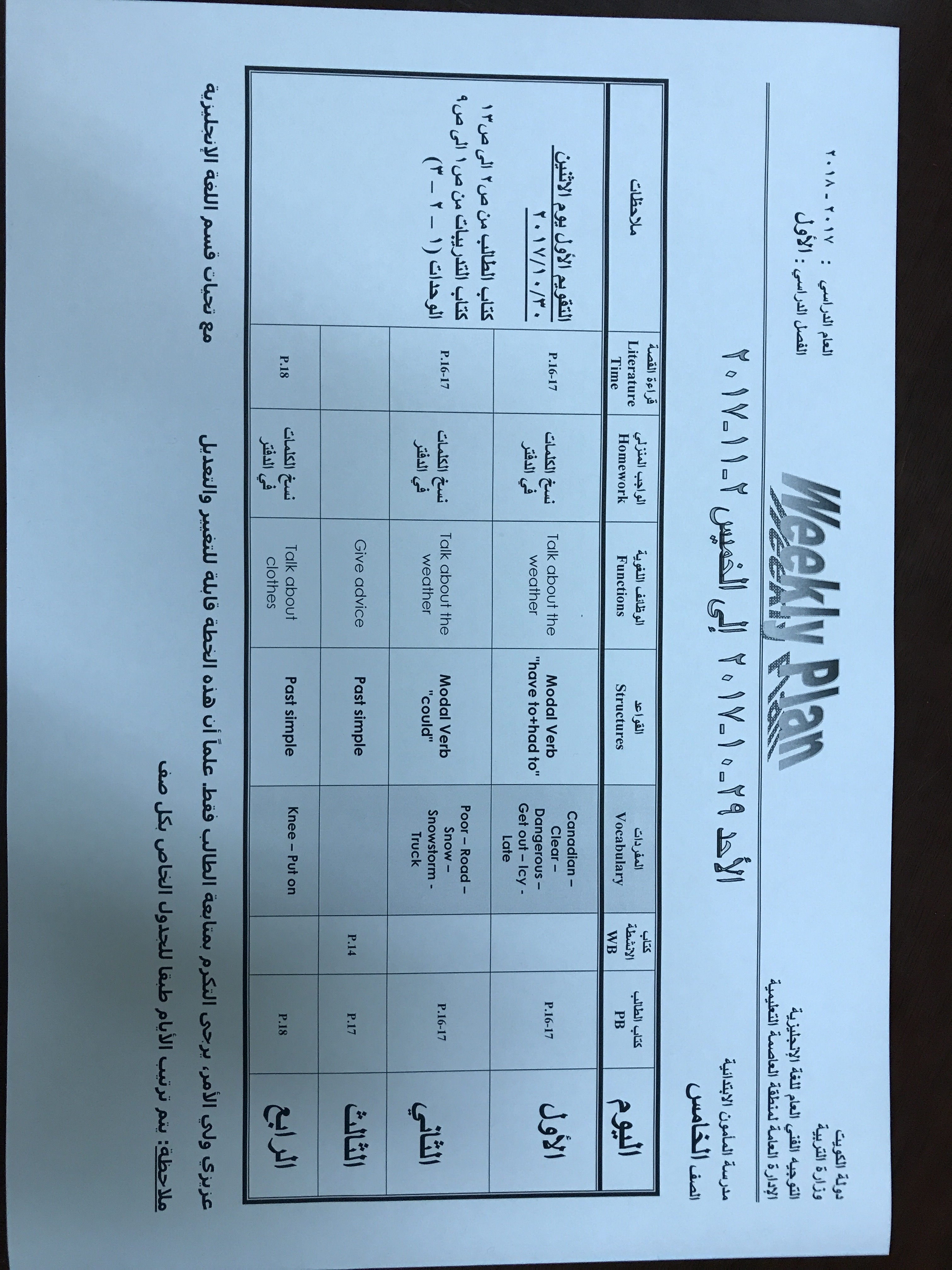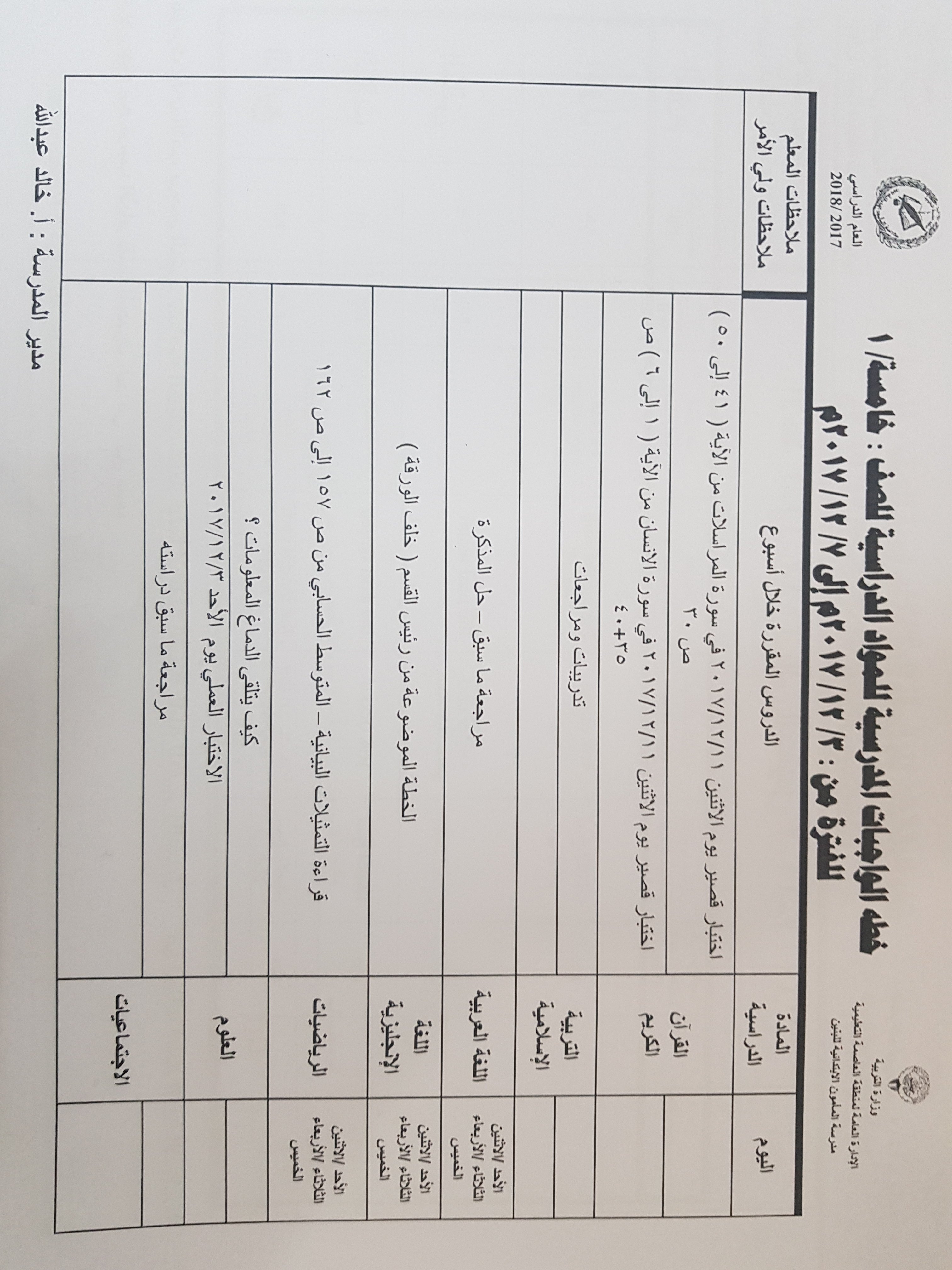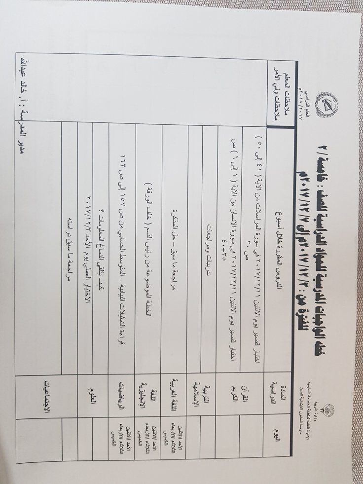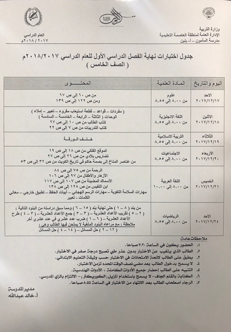جدول اختبارات الصف الخامس لنهاية الفصل الدراسي الاول
