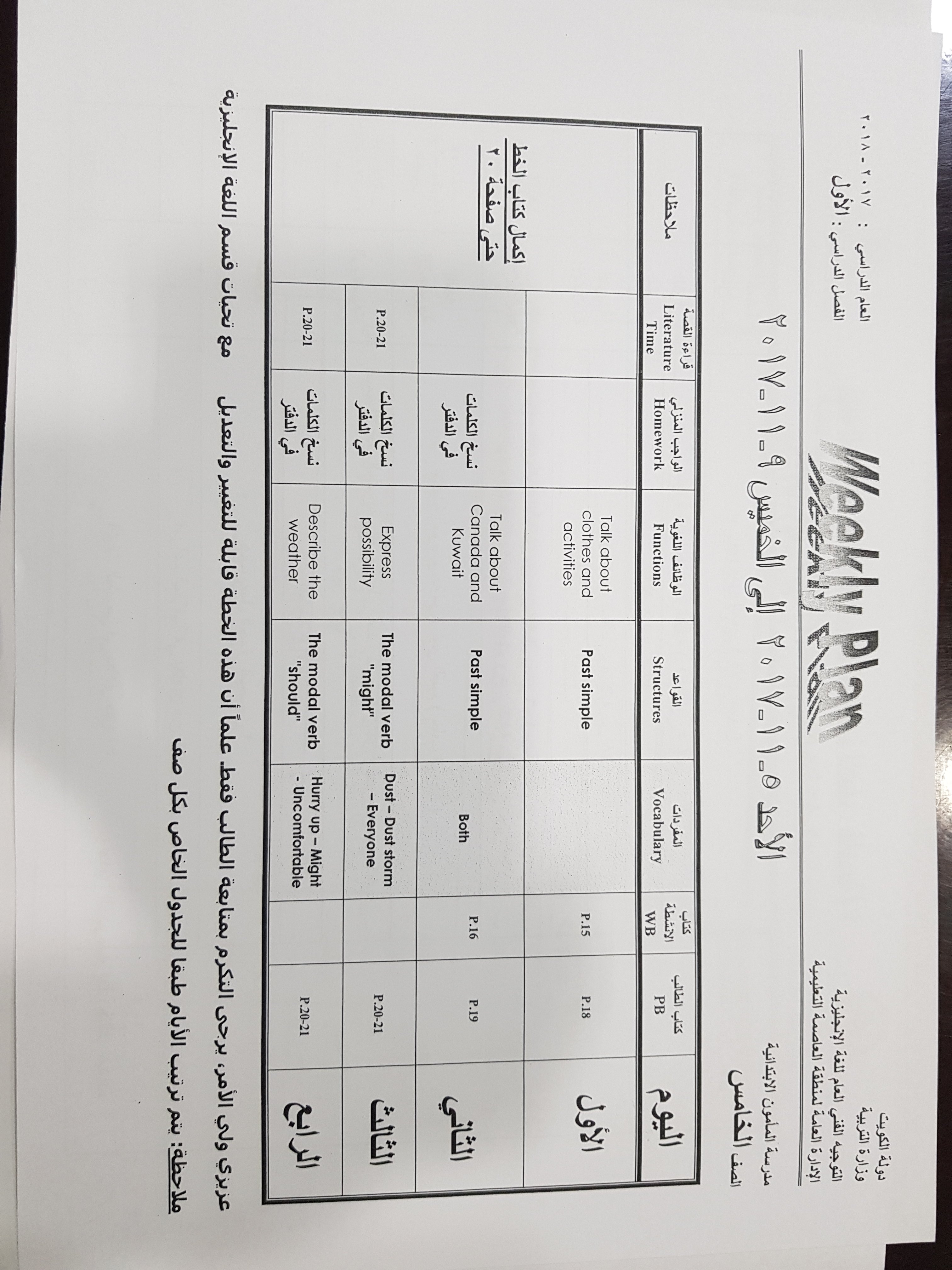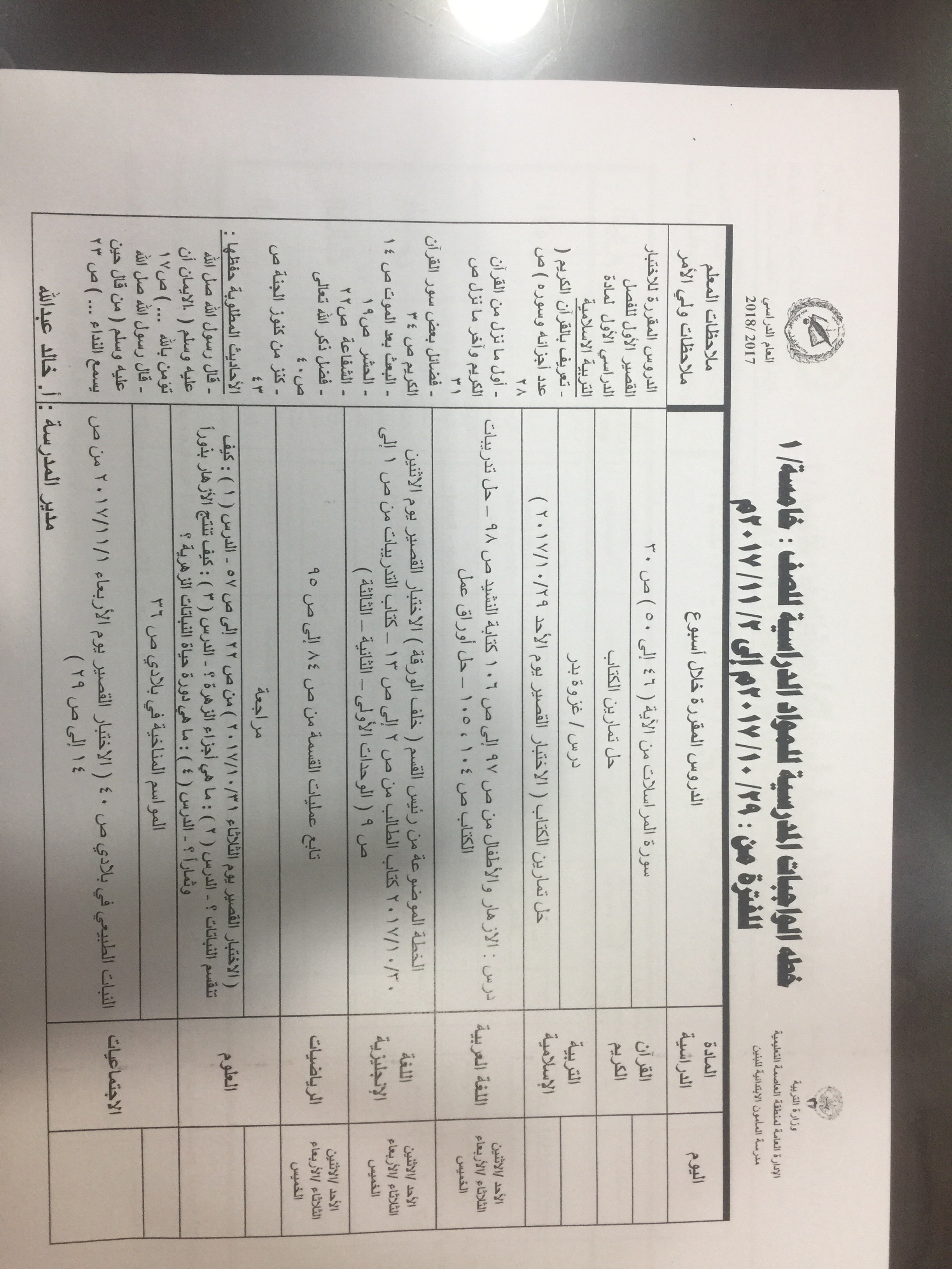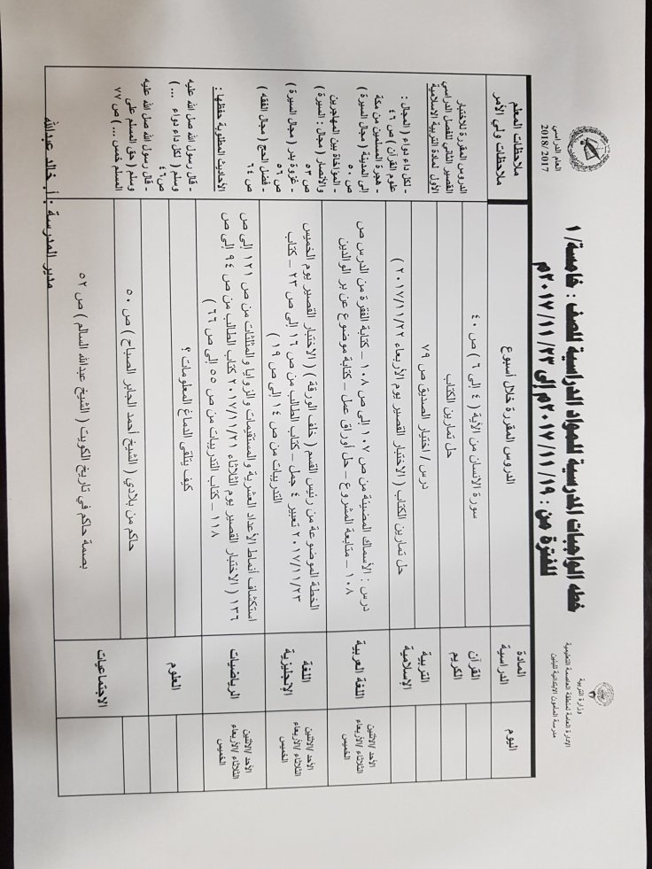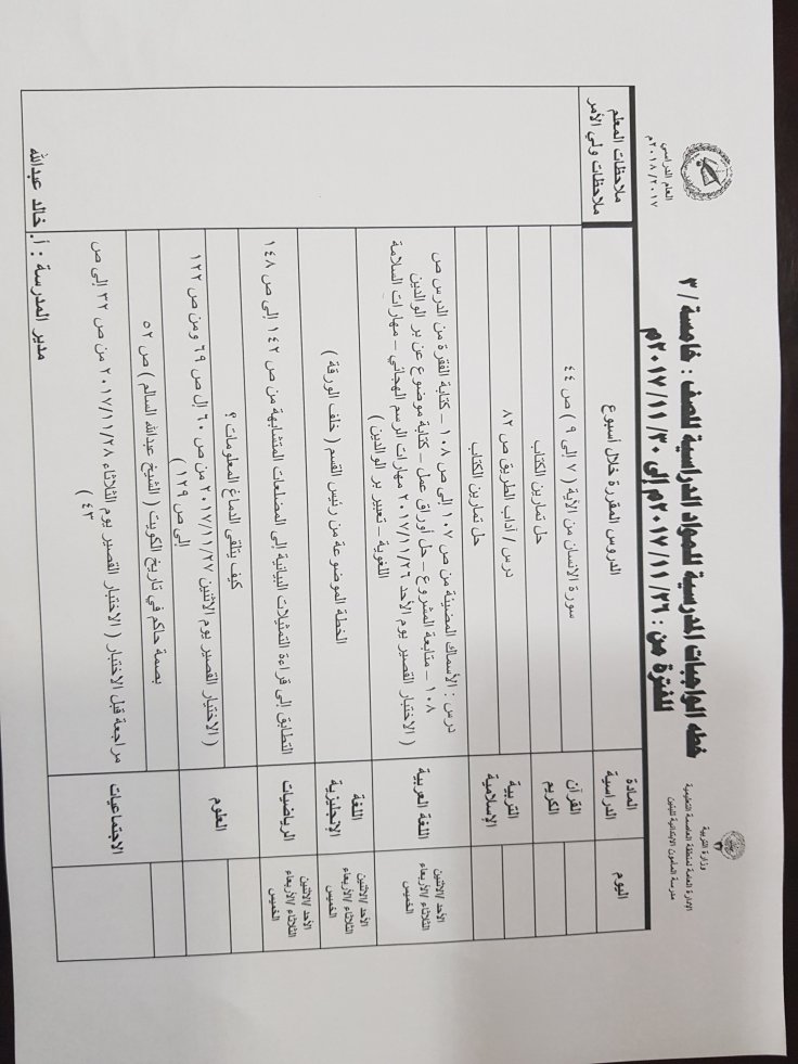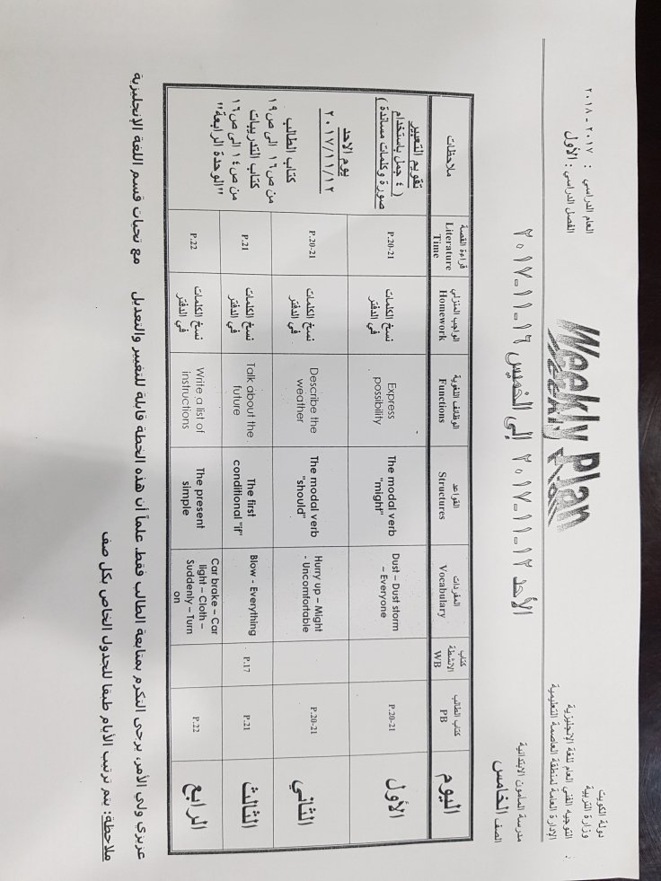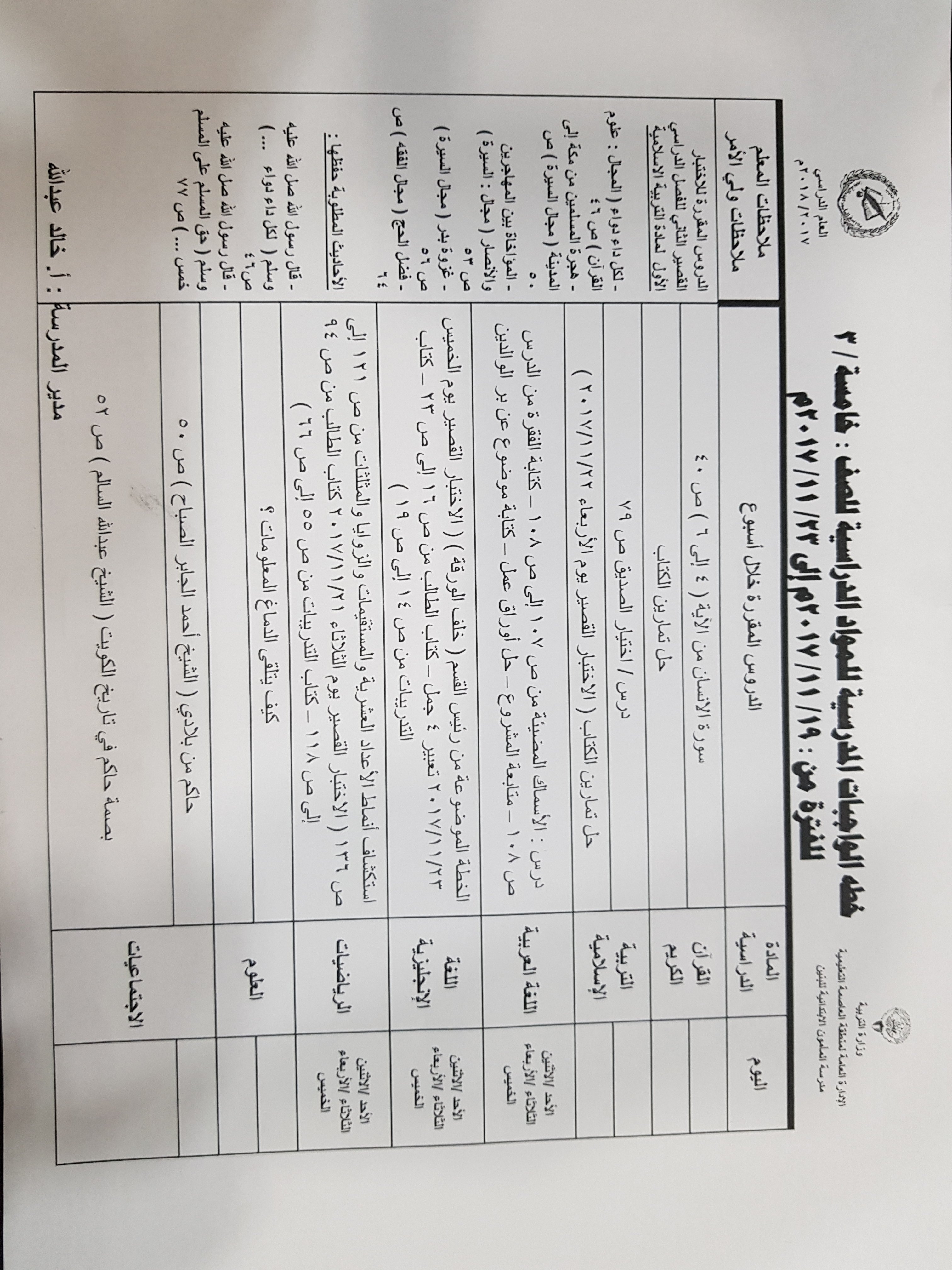 جدول اختبارات الصف الخامس لنهاية الفصل الدراسي الاول