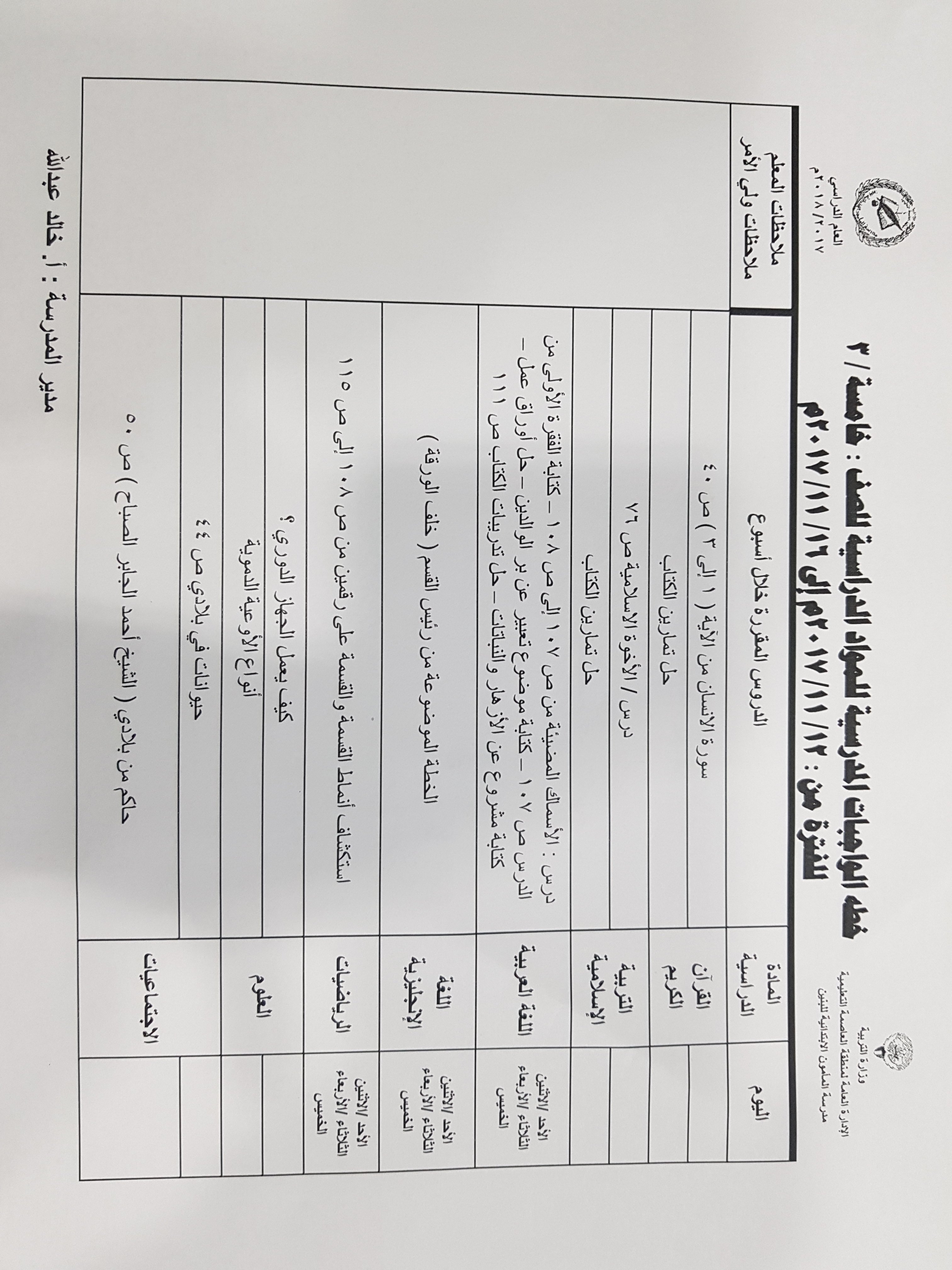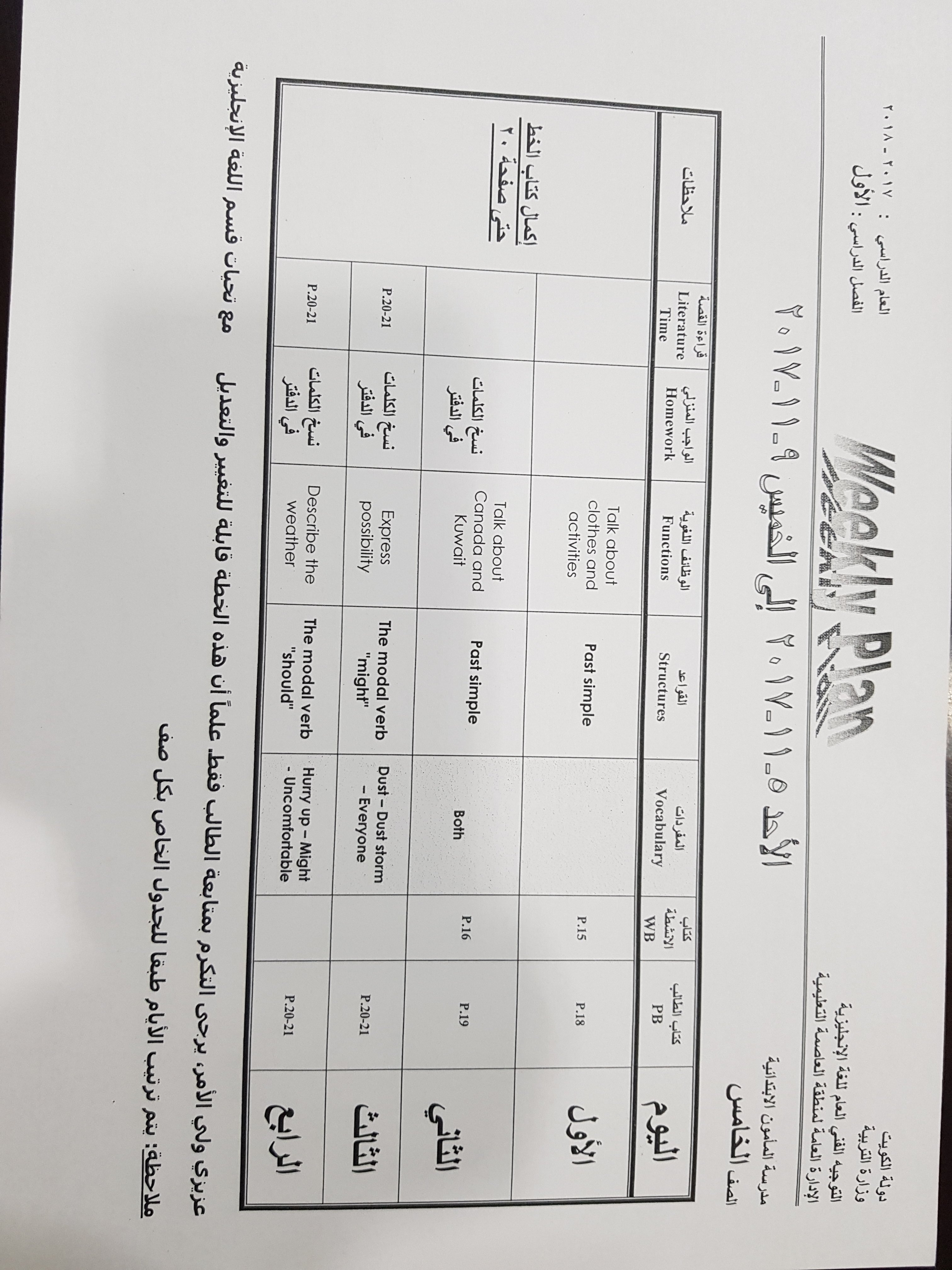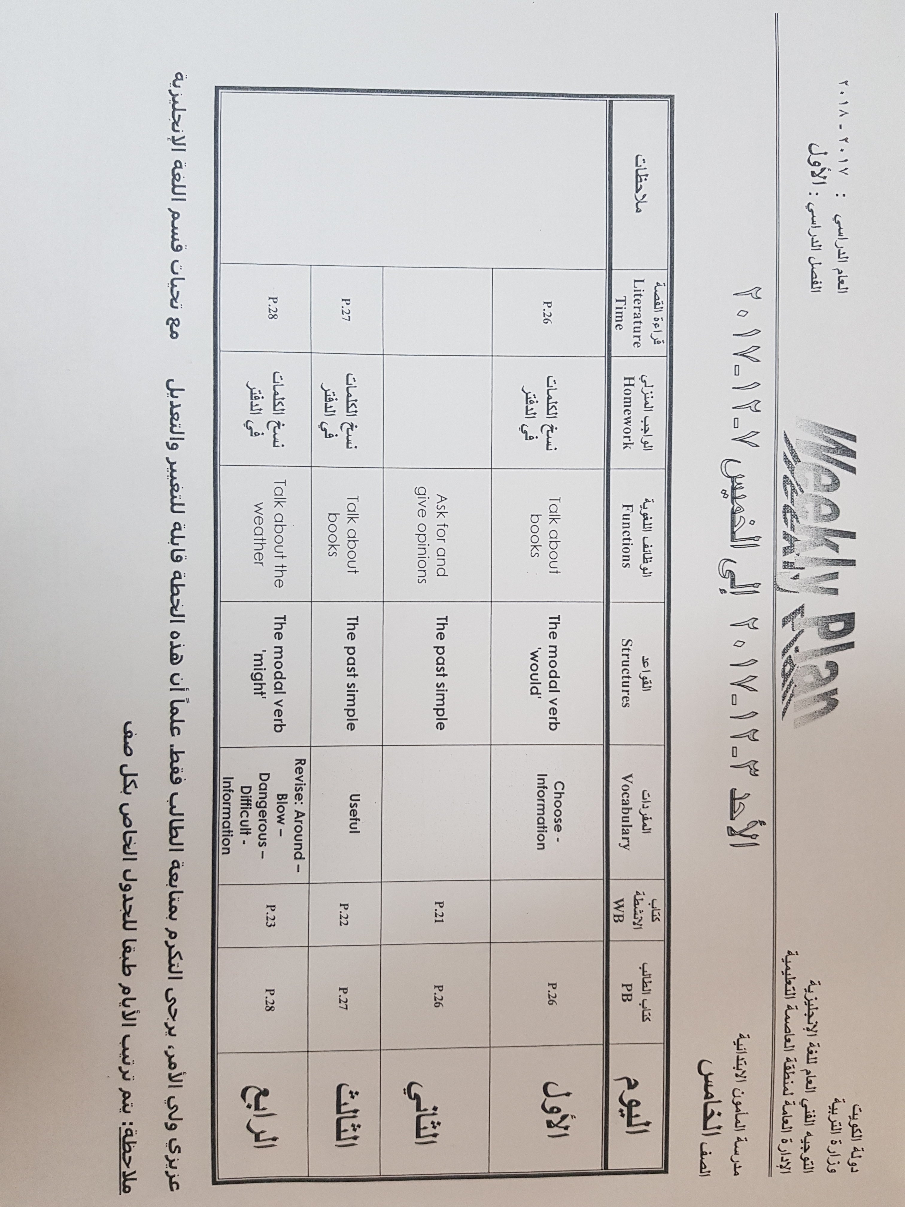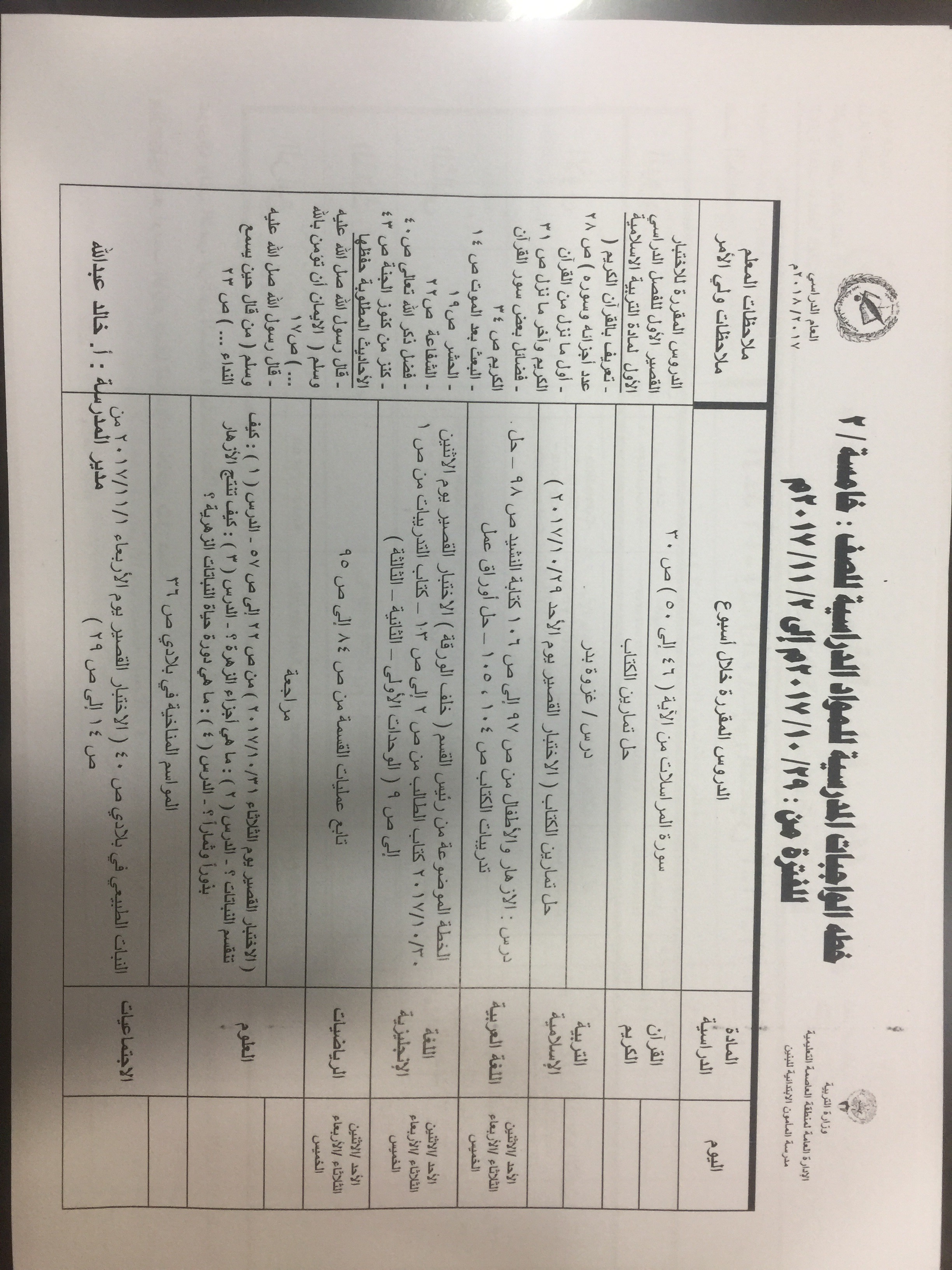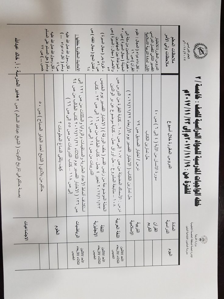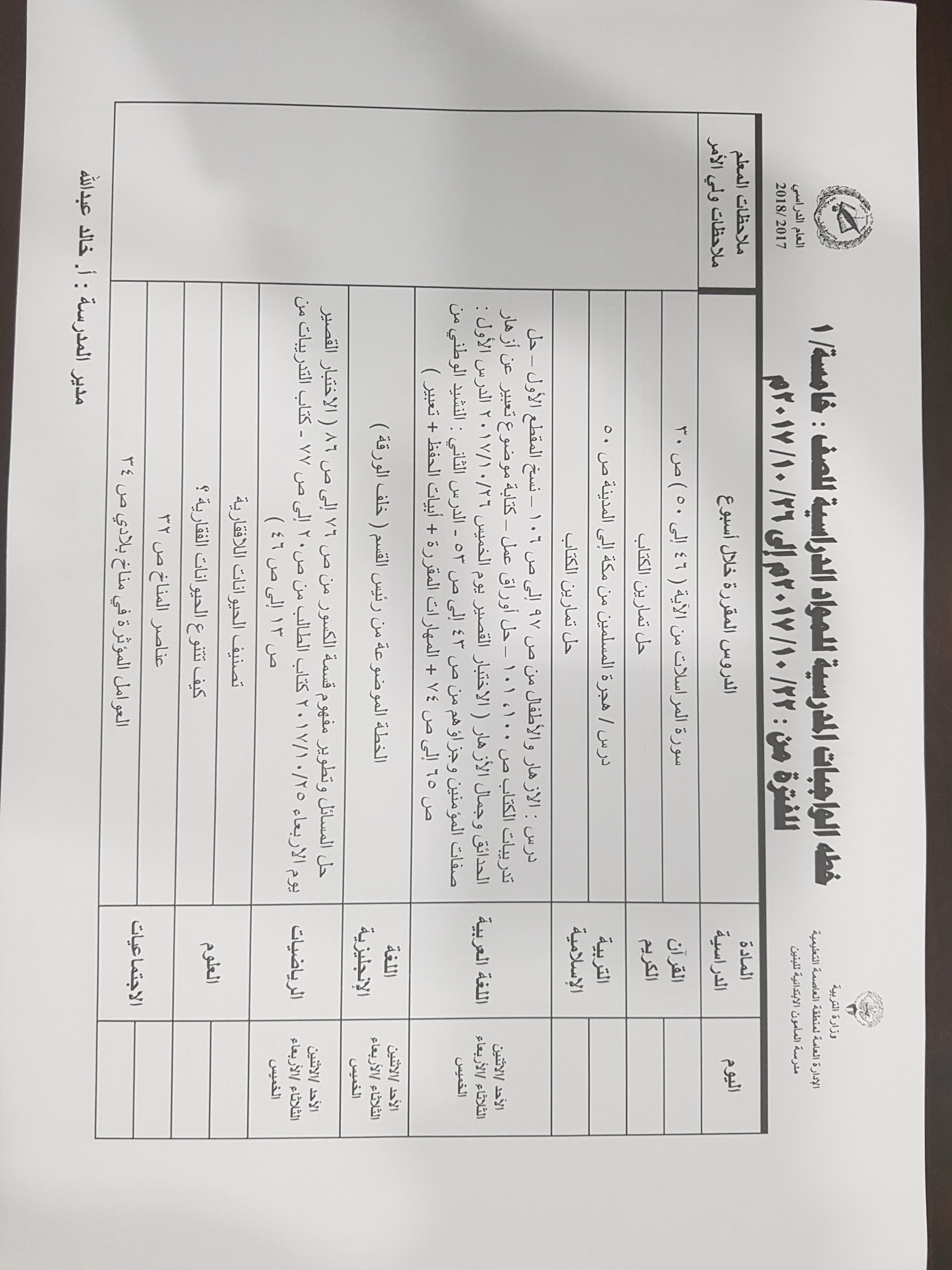جدول اختبارات الصف الخامس لنهاية الفصل الدراسي الاول